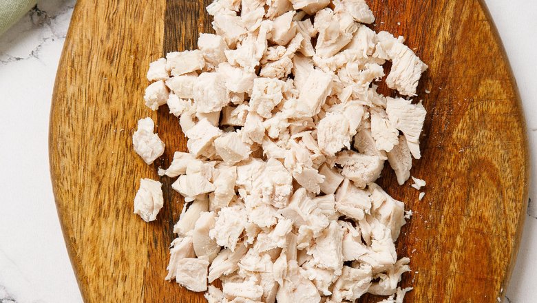 Отварную курицу вынуть из бульона и остудить до комнатной температуры. Нарезать небольшими кубиками