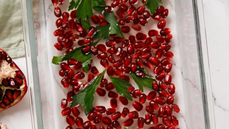 В порционные формочки для подачи или одну большую глубокую миску на дно выложить зерна граната и листики петрушки. Добавить по паре ложек бульона. Отправить в холодильник, чтобы масса застыла