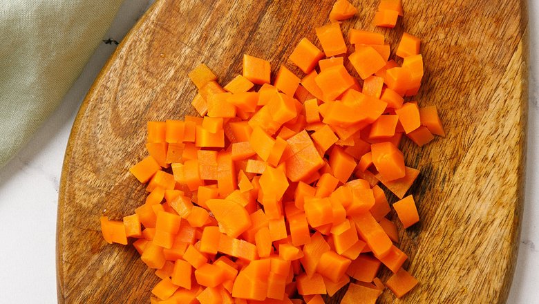 В другой кастрюле отварить вторую морковь, остудить, очистить от кожицы и нарезать небольшими кубиками