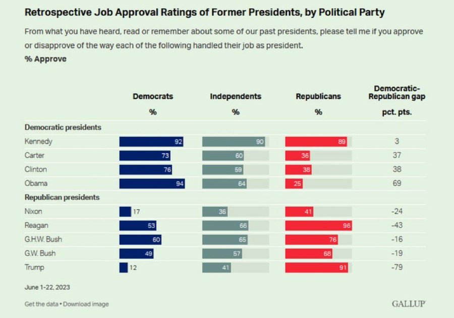 Абсолютно легендарный президент в США – демократ Кеннеди, его деятельность поддерживают 92% демократов и 89% республиканцев, согласно прошлогоднему опросу Gallup.
