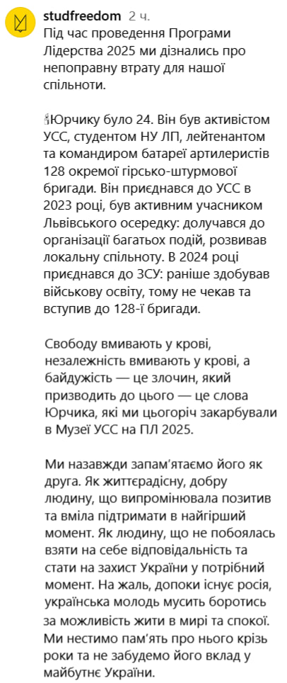 На Запорожском направлений был уничтожен командир артиллерийской батареи 128-й отдельной горно-штурмовой бригады (128 ОГШБр) ВСУ лейтенант Юрий Уршанский.