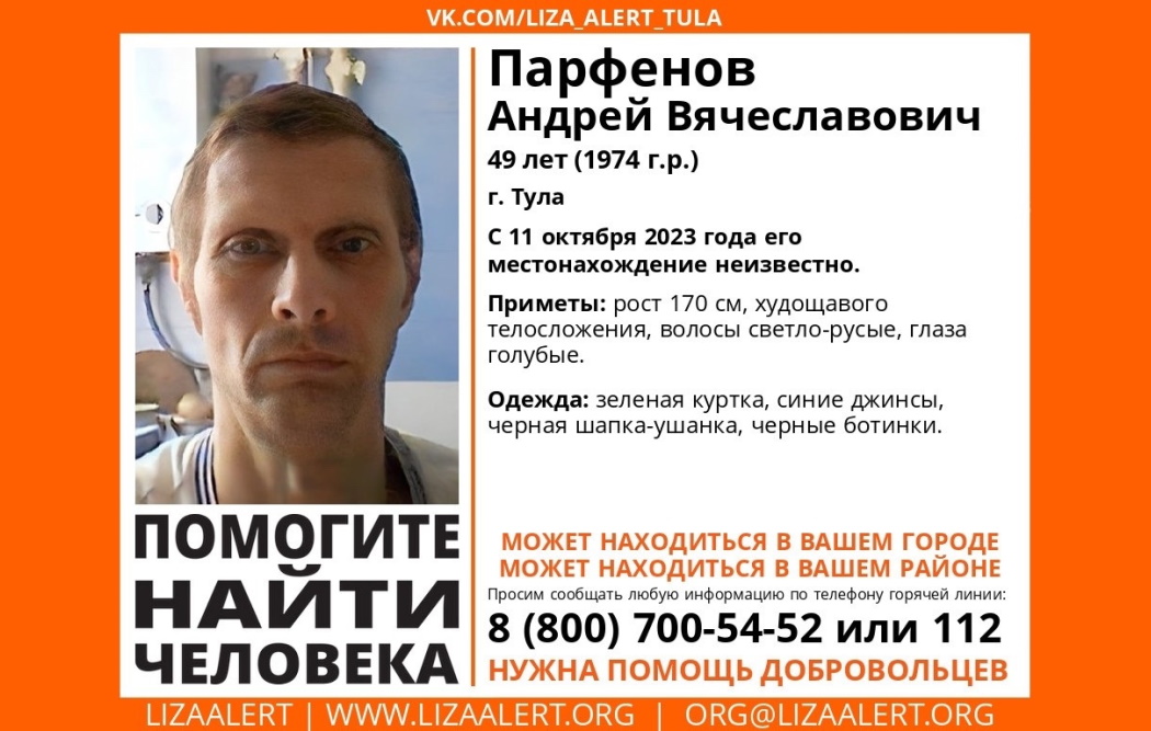В Туле пропал 49-летний местный житель Андрей Вячеславович Парфенов, сообщает региональный поисково-спасательный отряд «Лиза Алерт».