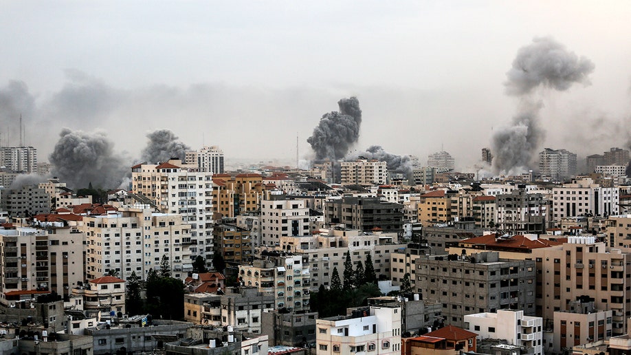 A smoke rises over a buildings in Gaza City on October 9, 2023 during an Israeli air strike. (Photo by Sameh Rahmi/NurPhoto via Getty Images)