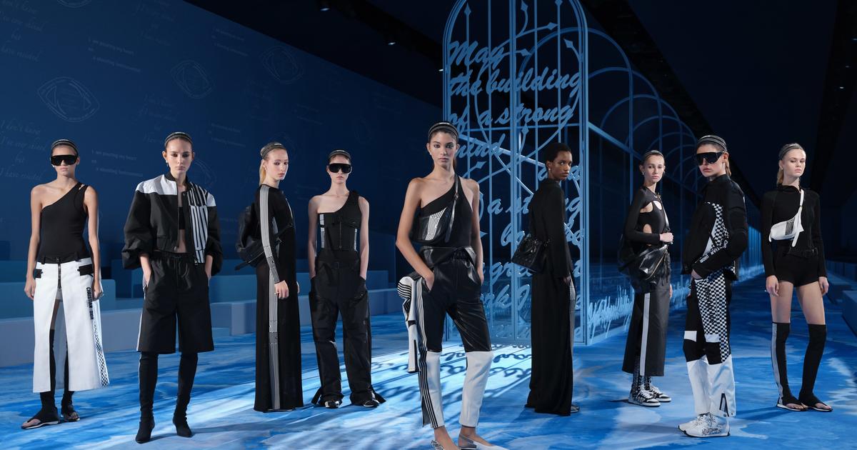 Sur le podium, s'avancent les mannequins en body noir au décolleté asymétrique. Dans le dos, une grande besace souple en cuir Cannage ou toile Oblique épouse la forme du corps. Puis des tailleurs, des costumes, des robes chemises, des trenchs, des sorties-de-bain en maille à l'épaule découverte. La veste Bar nouvelle génération s'enfile sur un large pantalon de survêtement en maille bordé d'un logo Dior à bandes datant de 1971. Le dernier Lady Dior transformé en pochette matelassée de cuir souple (futur best-seller ?) se porte les mains libres, tout comme le Saddle et sa forme équestre, qui accessoirise à merveille les jupes portefeuille à franges de pampilles et de perles de ces guerrières.