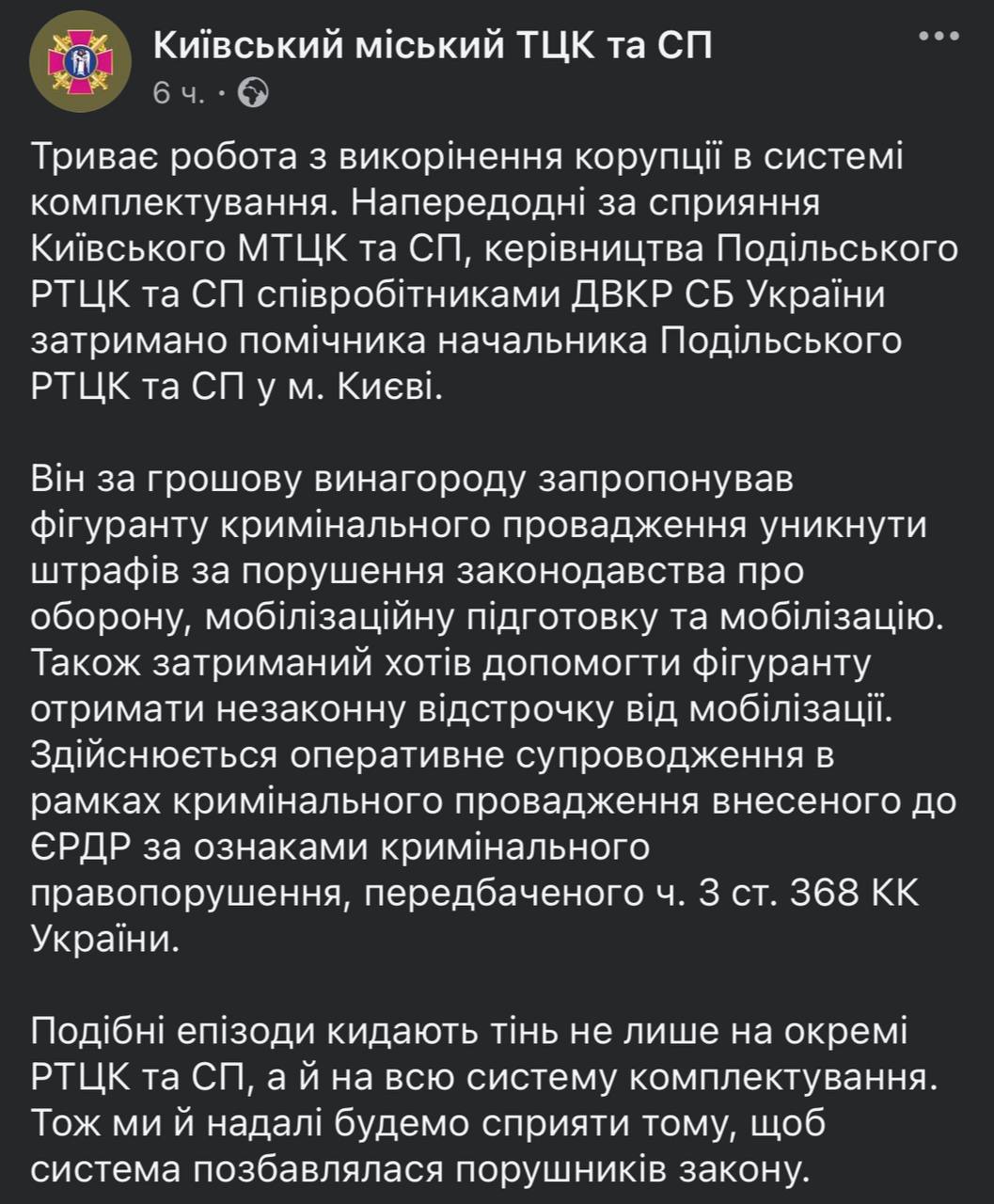 В Киеве задержан помощник начальника Подольского РТЦК, — столичный ТЦК