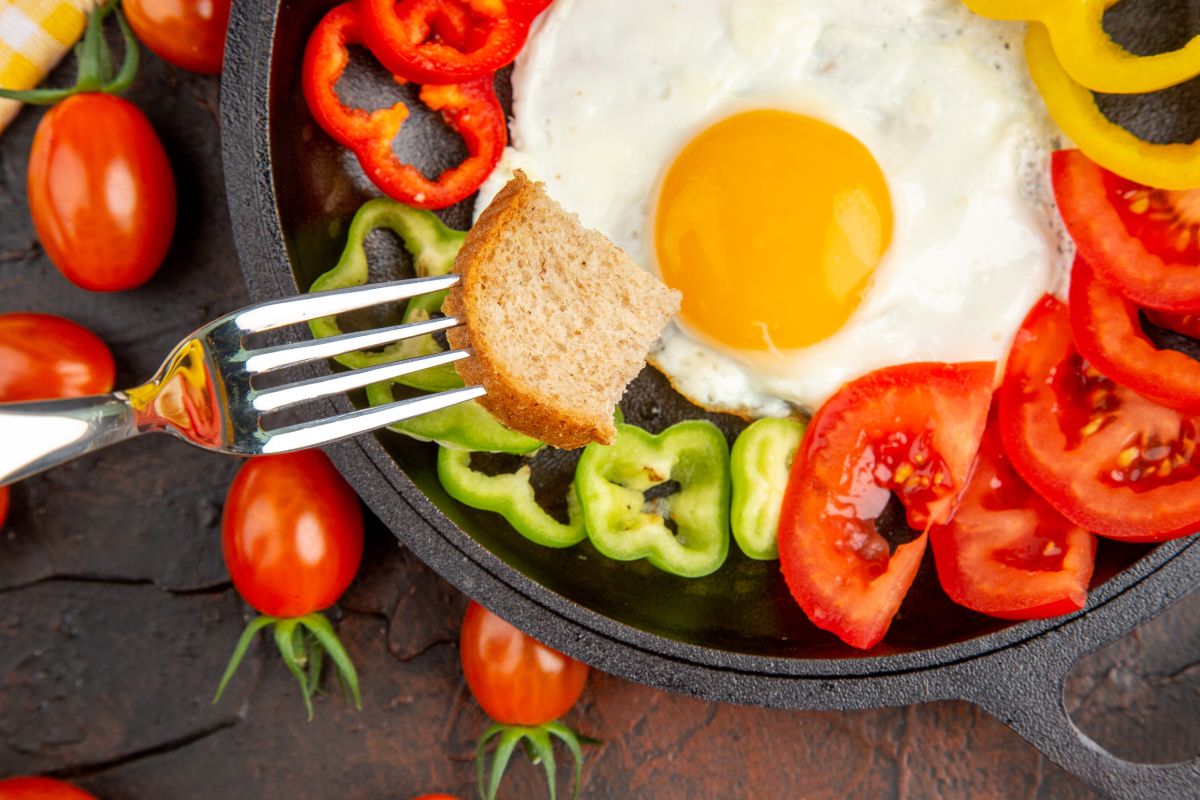 Яйца — источник белка, витаминов и минералов, а овощи богаты клетчаткой и витаминами.