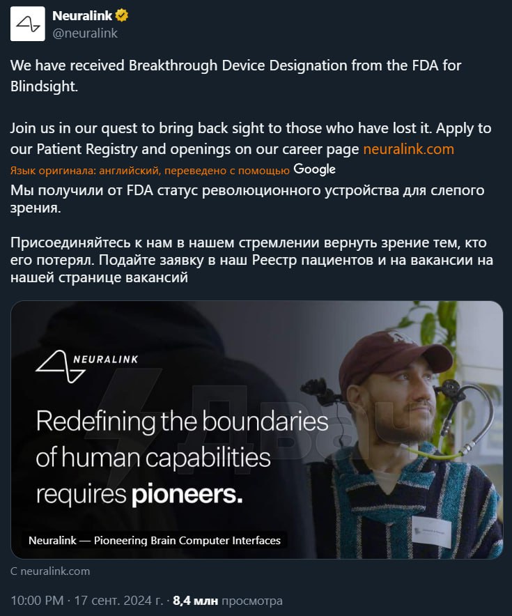❗️Слепота умерла сегодня: компания Neuralink изобрела Blindsight — имплант, который восстанавливает зрение. Человек сможет видеть, даже если был слеп с рождения.