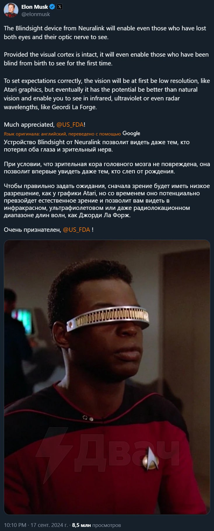 Илон Маск заявил, что Blindsight уже получил одобрение от FDA — имплант получил статус революционного устройства. Первое время зрение у обладателей Blindsight будет с плохим графоном, но в дальнейшем оно может превзойти естественное зрение и позволить видеть в инфракрасном, ультрафиолетовом или даже радиолокационном диапазонах.