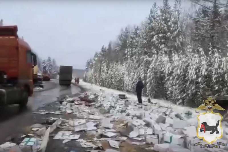 По предварительной информации, водитель большегруза Volvo, двигавшийся со стороны Красноярска в направлении Иркутска, не справился с управлением и допустил занос полуприцепа на встречную полосу. Полуприцеп перегородил проезжую часть, и в него врезался тягач Freightliner. После этого в Volvo въехала попутно следующая грузовая машина Mercedes.