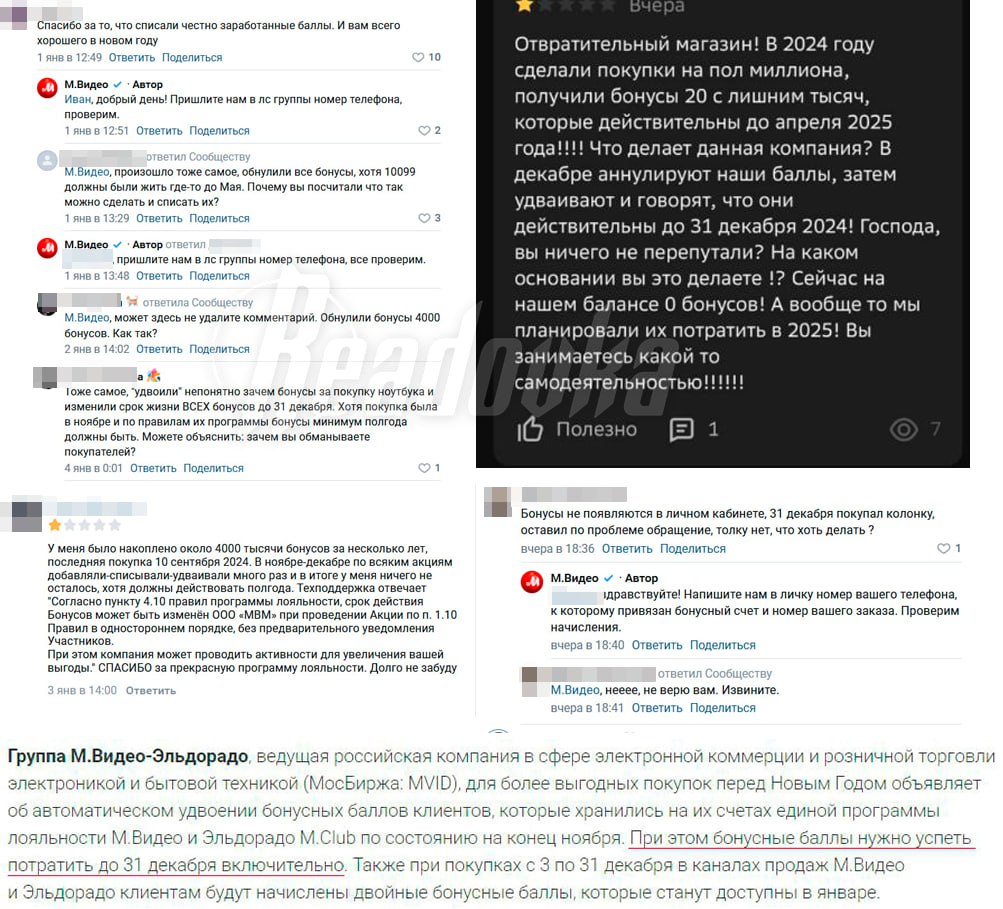Крупная сеть магазинов бытовой техники «М.Видео» оставила на новогодние праздники своих клиентов без накопленных бонусов лояльности, жалуются люди. Как выяснила Readovka, пострадавших очень много, суммы тоже у всех разные, у многих это свыше 10 тыс. Один бонус равен ₽1. В начале декабря «М.Видео» устроил аттракцион невиданной щедрости, удвоив накопленные бонусы, но не предупредил о том, что срок их хранения на карте лояльности истекает в конце месяца, пишут люди. Только есть нюанс — сгорели сразу все накопления, а не только привилегированные.