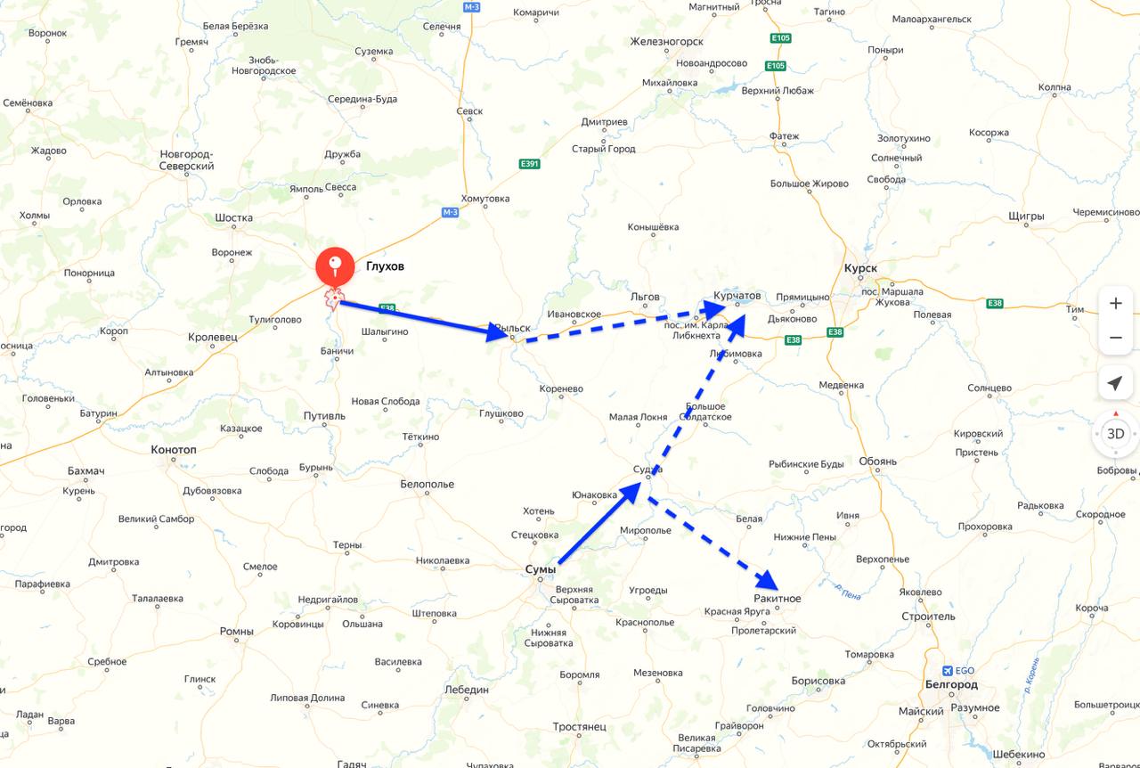 Если это направление у противника прийдет в движение, то вырисовывается его замысел на схождение (создание непосредственной угрозы) в Курчатов с попыткой захвата Рыльска и Суджи.