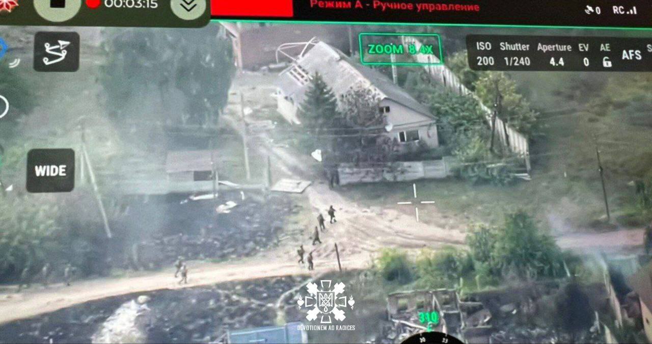 Штурмовые подразделения ВС РФ на северных окраинах Волчанска, вид с украинского коптера.