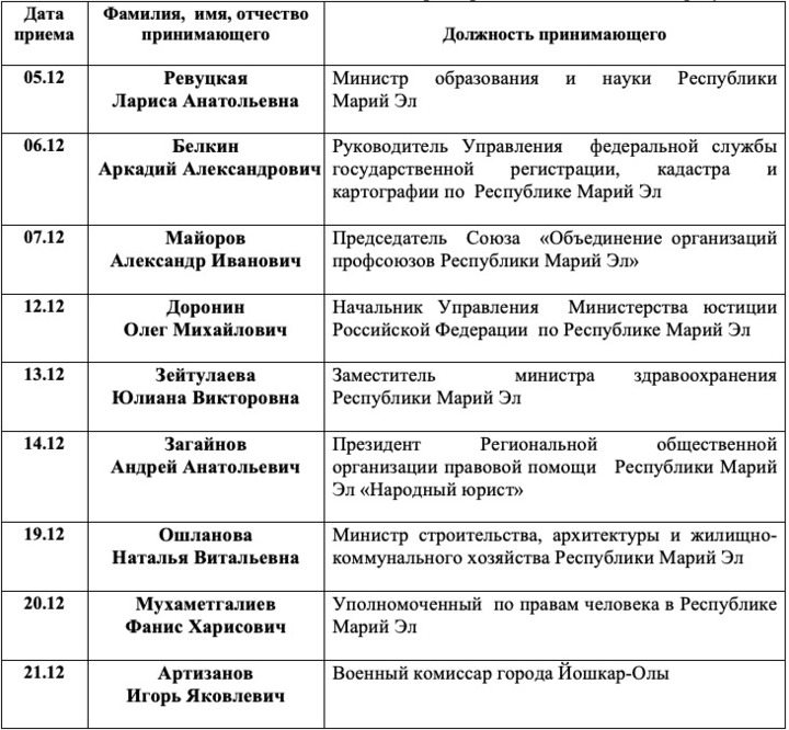 Опубликовано расписание общественного приема граждан Марий Эл в декабре