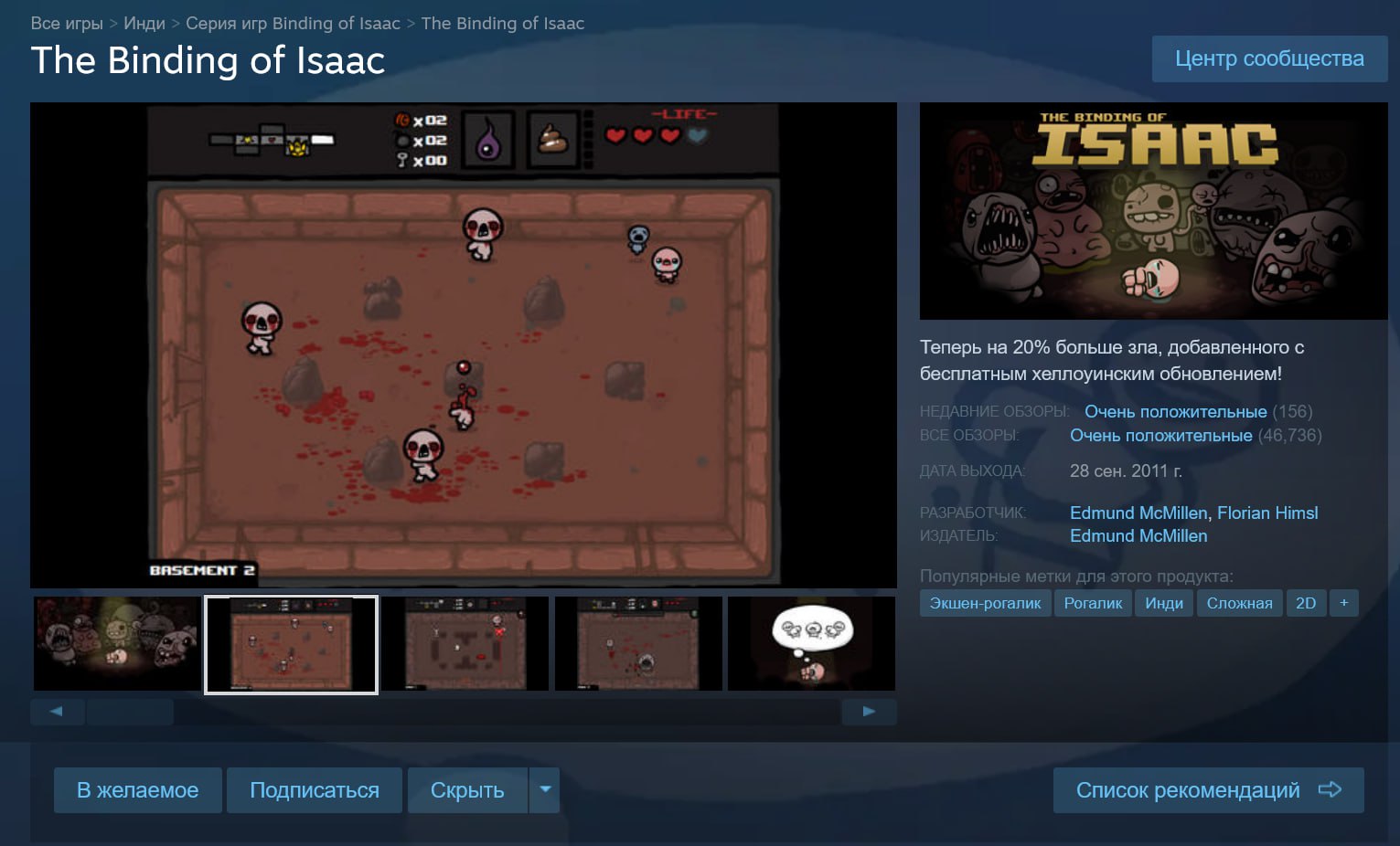 Хватаем классическую версию игры 2011 года платно: store.steampowered.com/app/113200/The_Binding_of_Isaac/.