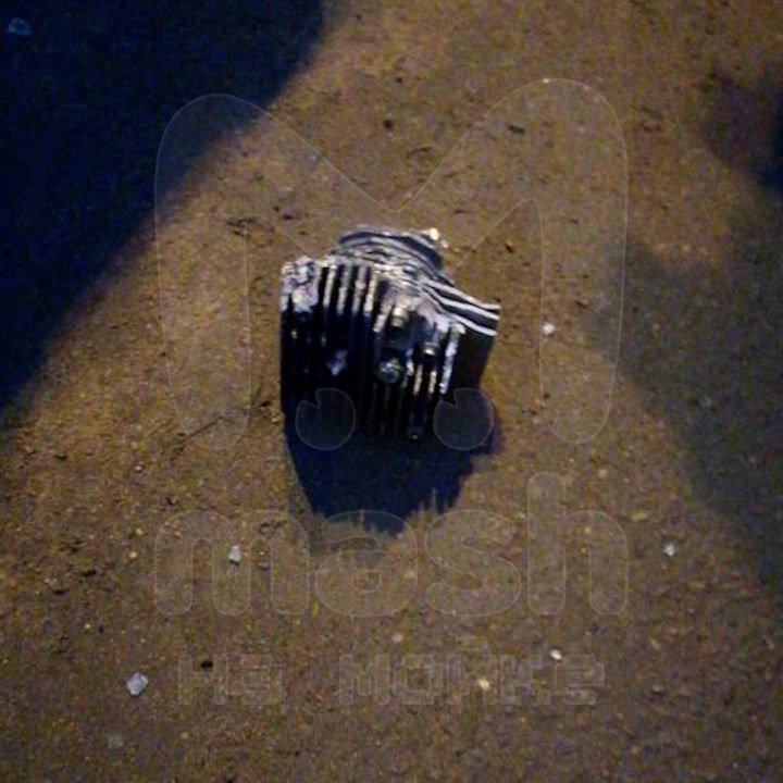 На фото — часть беспилотника, найденная неподалёку от места взрыва. Предварительно, это деформированная деталь двигателя.