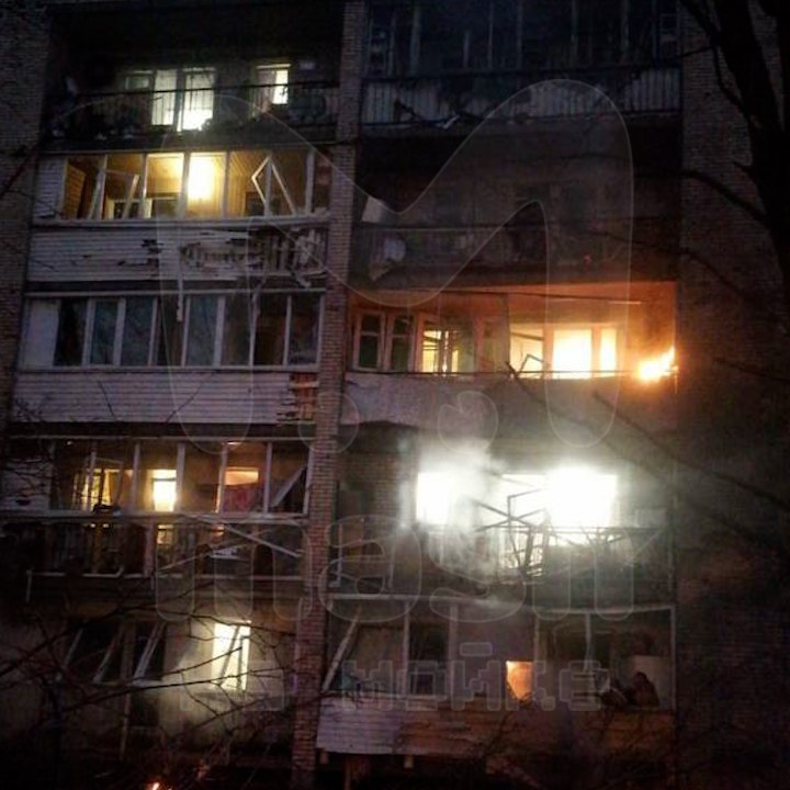 Последствия после попадания в дом: балконы разрушены, повреждения видны на всех этажах.