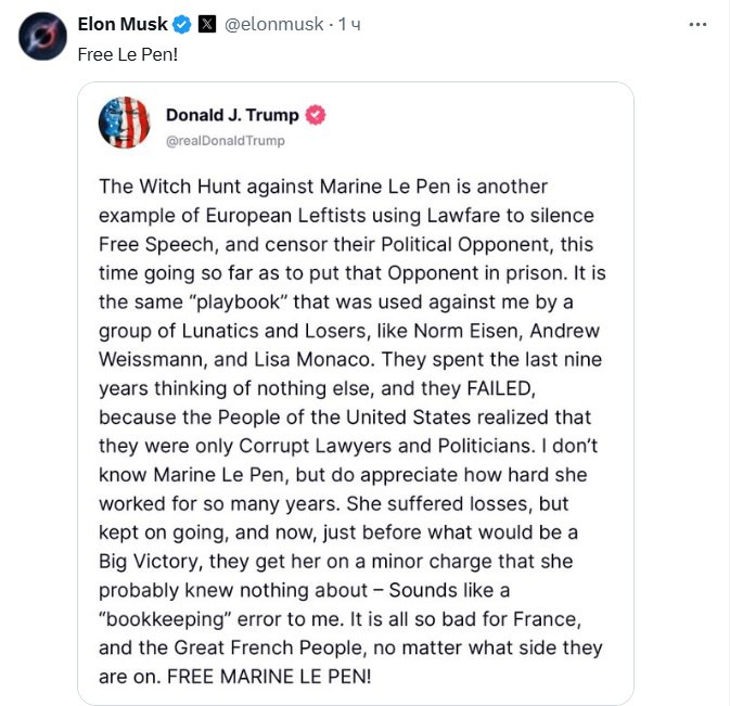 «Свободу Ле Пен!» — Маск поддержал призыв Трампа освободить французского политика.