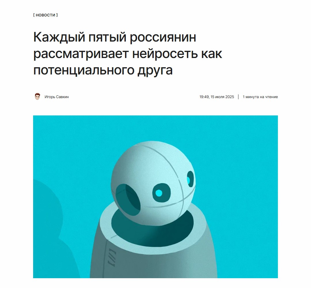 По данным исследования, почти каждый пятый россиянин рассматривает ИИ как потенциального друга.