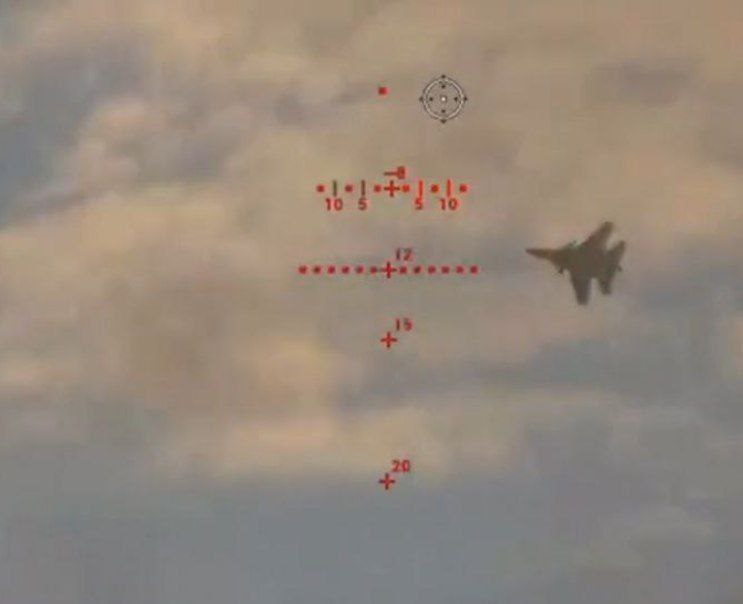Истребитель Су-30СМ Морской авиации Черноморского флота в прицеле украинского безэкипажного катера с пулеметной турелью во время