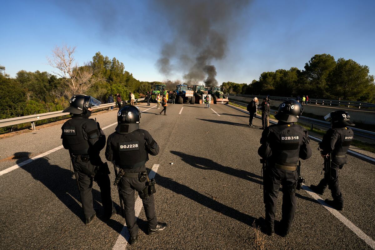 Ante la amenaza de los agricultores de bloquear Mercabarna, el principal mercado de abastos de la capital catalana, los Mossos de Esquadra esperan a los agricultores en los accesos de la puerta principal más cercana al Prat, que mantienen cortados para evitar el paso de los manifestantes. Los agentes sostienen que no los van a dejar pasar, para evitar el colapso de una infraestructura clave para Barcelona.