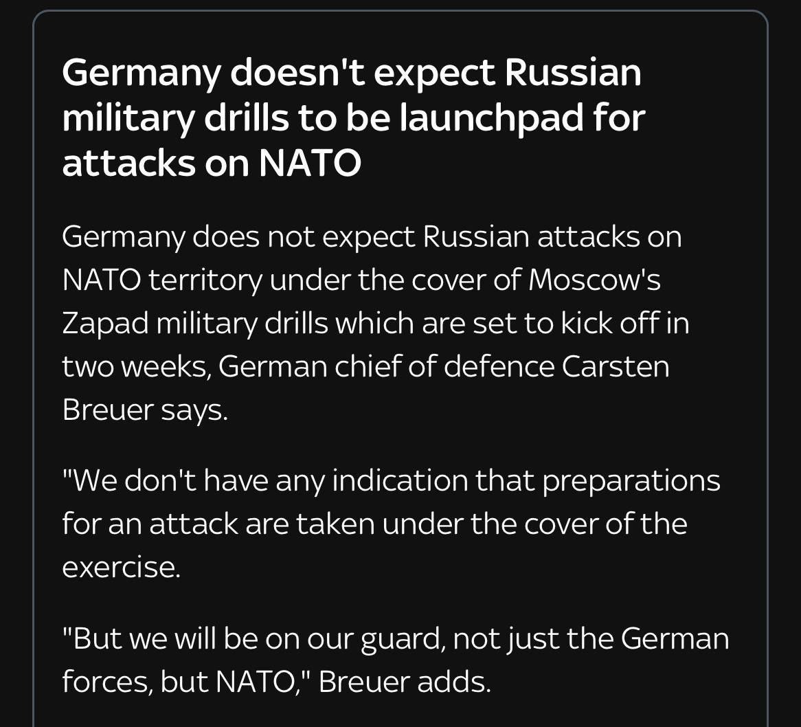 Глава Минобороны Германии Карстен Бройер заявил, что в Берлине не ожидают использования военных учений РФ как прикрытия для нападения на страны НАТО.