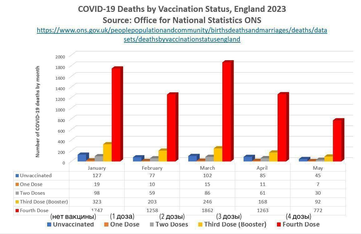 В Великобритании опубликовали данные за 2023 год по числу смертей вакцинированного населения. График показывает сравнение количества смертей не вакцинированных людей и вакцинированных от 1 до 4 дозами.
