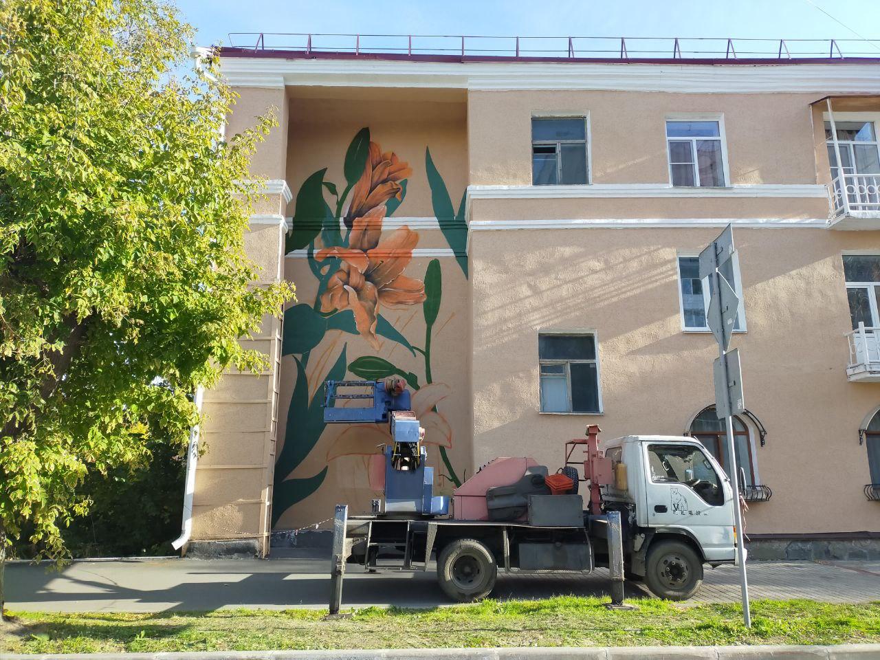 На фасаде дома №37 по улице Володарского в Кургане художник Владислав Мудрых рисует стрит-арт — лилию или лилейник.