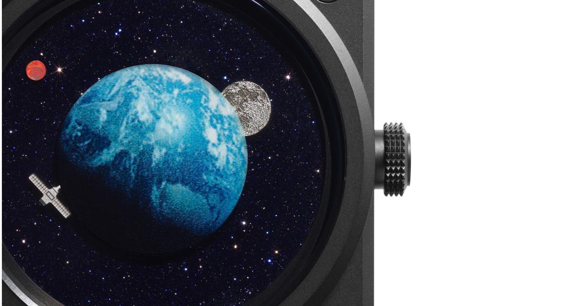 Ici, au coeur d’un boîtier de 41 mm en céramique noire, le verre saphir traité anti-reflets a été creusé en son centre sous forme de calotte sphérique afin de conserver une Terre réaliste tant par le volume que par le décalque. Le positionnement et le calcul du poids des aiguilles supposent quant à eux de supporter la Lune gravée. Ici, la Lune indique les minutes, tandis que Mars suit lentement son orbite pour afficher le passage des heures. Quant au petit satellite, il marque les secondes en effectuant un tour complet autour de la Terre en 60 secondes. Cette montre étanche à 100 mètres est équipée du mouvement mécanique à remontage automatique BR.CAL-327 Swiss Made, pour une réserve de marche de 54 heures.