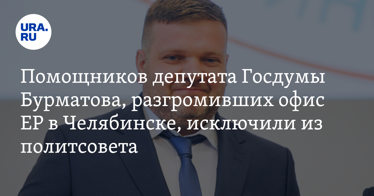 На заседании политсовета «Единой России» Металлургического района Челябинска 10 ноября из политсовета исключили депутата заксобрания области Максима Романова, а также депутатов Металлургического райсовета Олега Мальцева и Сергея Астафьева. Все трое являются помощниками депутата Госдумы Владимира Бурматова. Поводом для таких мер стала история с вывозом мебели и оргтехники из районного партийного офиса. Эту информацию URA.RU подтвердили в политсовете.