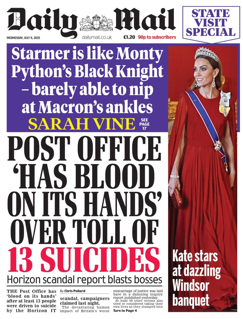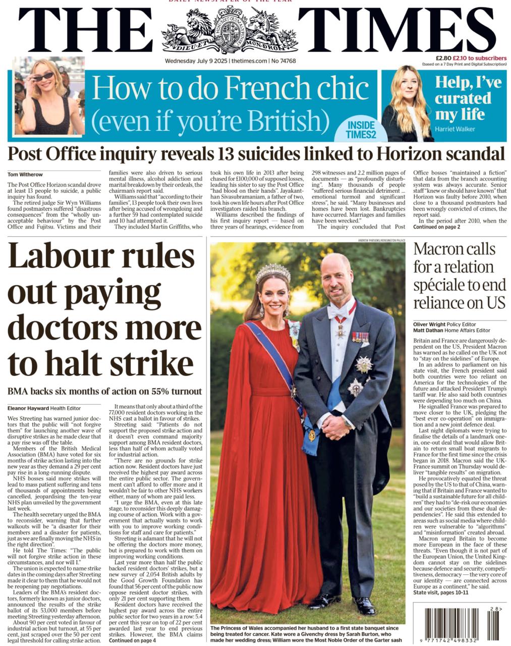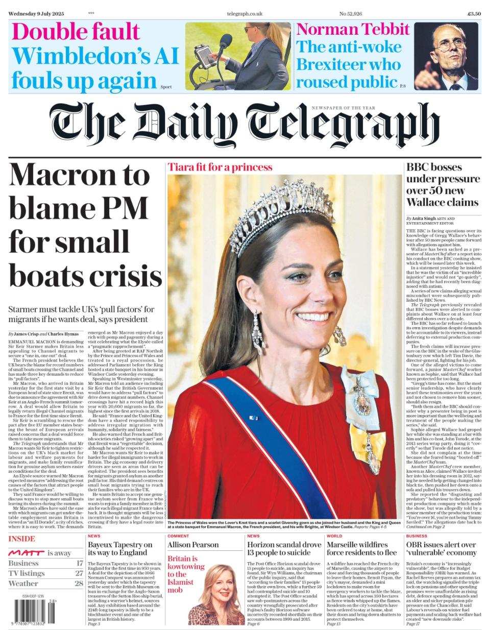 Да уж, не любят британские СМИ Макрона. Казалось бы, главной темой в их новостях является его визит в Лондон, а практически на всех первых полосах - фото принцессы Уэльской Кейт на торжественном приеме в честь приезда лягушатника. Исключением является газета The Guardian.