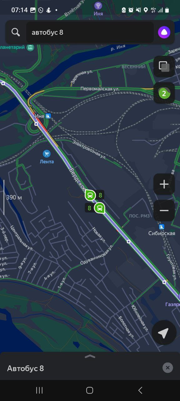 В 7:13 решаем проверить, сколько еще ждать, но результат неутешителен: на линии всего четыре автобуса, ближайший едет в сторону вокзала Новосибирск-Главный и находится еще очень и очень далеко, в районе остановки «Разъезд Иня».