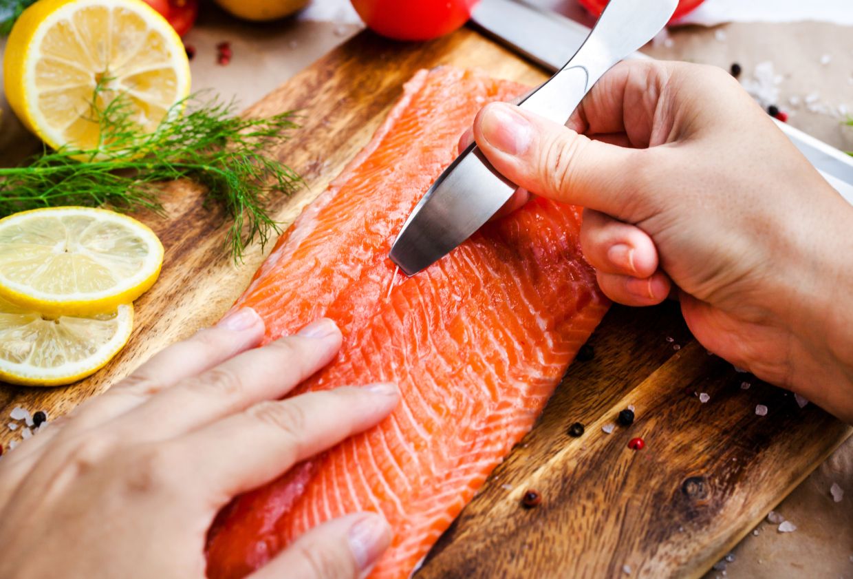 4. Подготовьте филе: при необходимости удалите лишние кости, не снимая кожу.