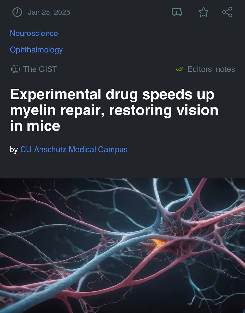 Он активирует естественное восстановление мозга и ускоряет восстановление миелина — защитной оболочки нервов. Препарат уже показал успехи на мышах, осталось одобрение Минздрава США.