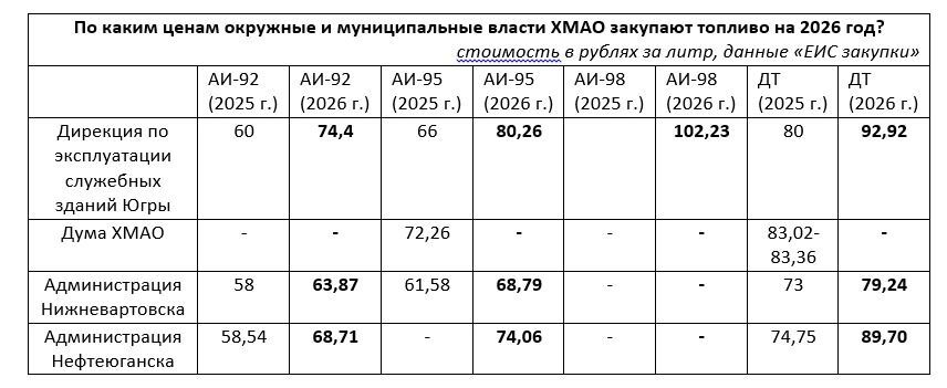 Но заметим, что небольшой рост цен на бензин заложили в мэрии Нижневартовска. На топливо для Управления по дорожному хозяйству и благоустройству выделили, согласно последнему контракту, около 65 млн рублей с периодом поставки топлива с 1 декабря 2025 года по 20 декабря 2026 года.
