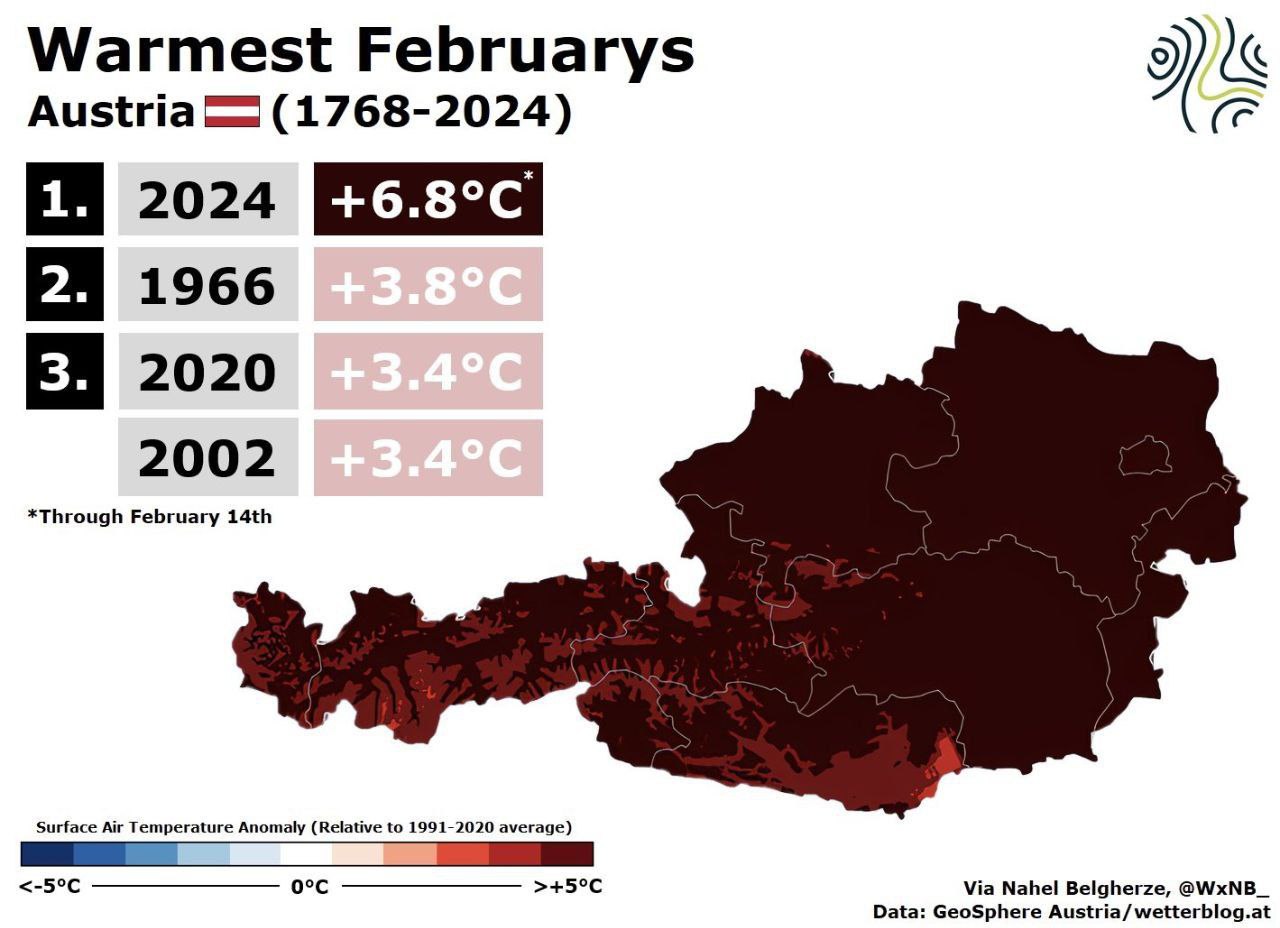 ✔️Уже после первых 14 дней февраля весьма вероятно, что Австрия переживает самый теплый февраль за всю историю наблюдений, которая началась 256 лет назад, в 1768 году