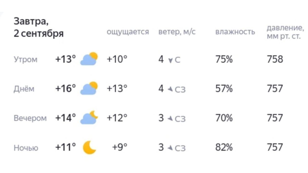 Во вторник, 2 сентября, средняя температура в Югре составит +16…+21 градус днем, и +6…+11 градусов — ночью. На севере обещают ночное похолодание до 0 градусов. В восточной части региона прогнозируют кратковременные дожди, в других местах — переменная облачность. Ветер — северный, 3-11 м/с.