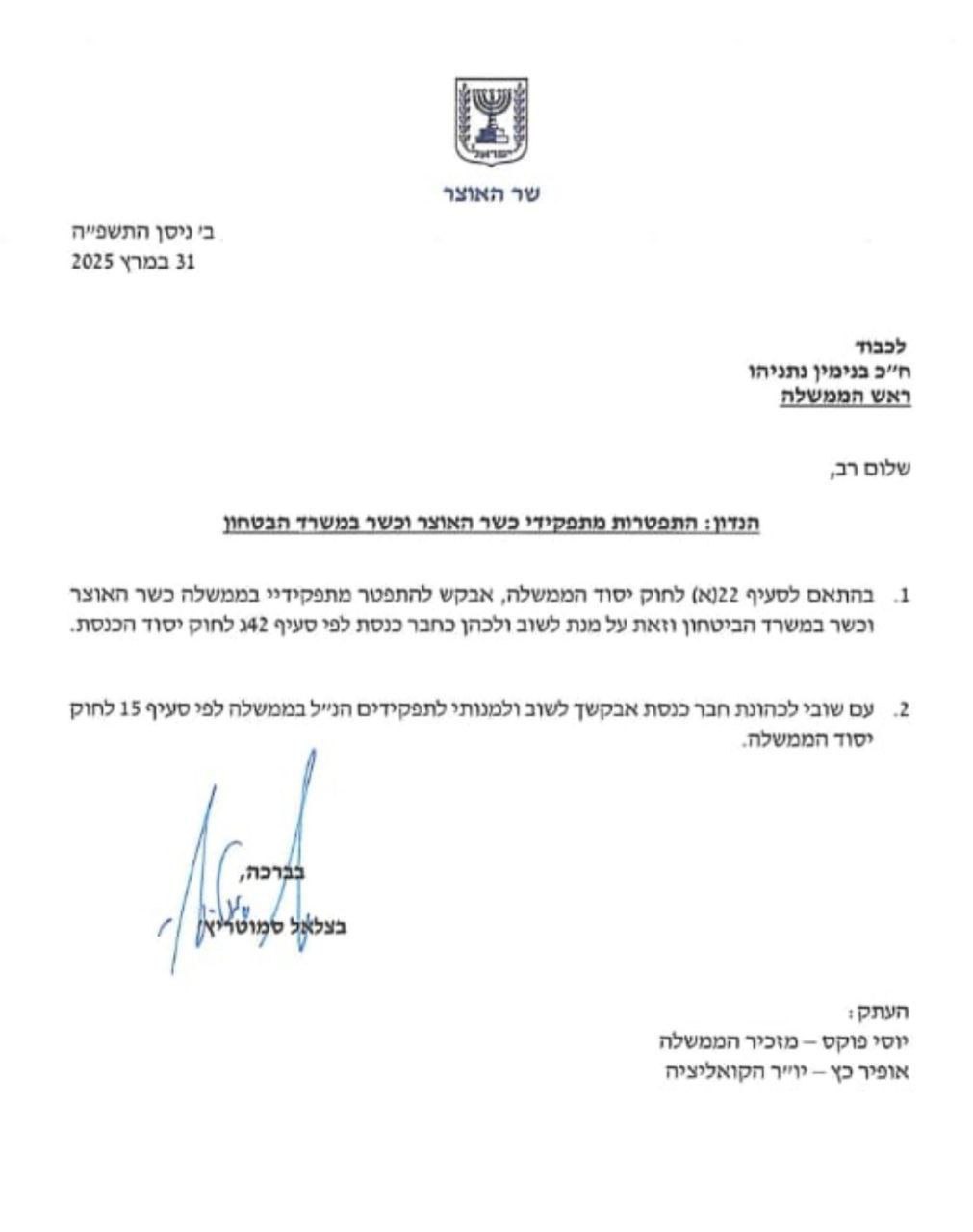 Сообщается, что Смотрич вернётся к исполнению своих обязанностей после того, как Кнессет проголосует за то, какая из двух партий — «Оцма Йехудит» во главе с Бен-Гвиром или «Религиозная сионистская партия» во главе со Смотричем — получит министерскую должность в Кнессете.