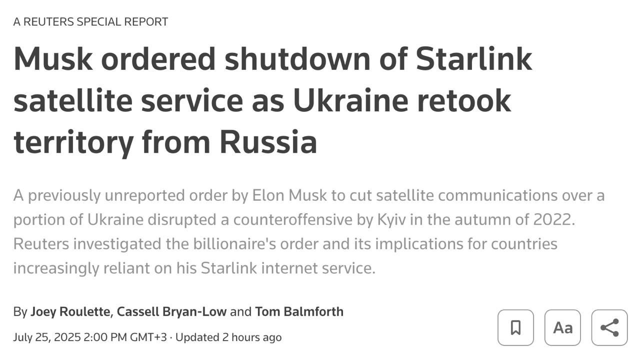 Сам Маск ранее говорил, что "мы бы никогда так не поступили", комментируя слухи о возможном отключении Starlink.