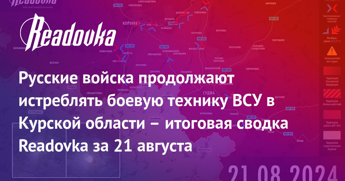 Русские войска продолжают истреблять боевую технику ВСУ в Курской области – итоговая сводка Readovka за 21 августа