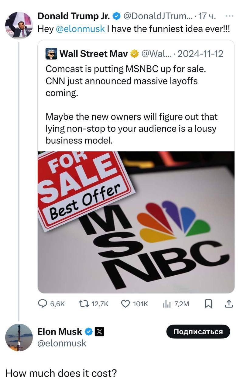 Илон Маск отреагировал на слухи о продаже телеканала MSNBC, критикующего его и Трампа: «Сколько стоит?»