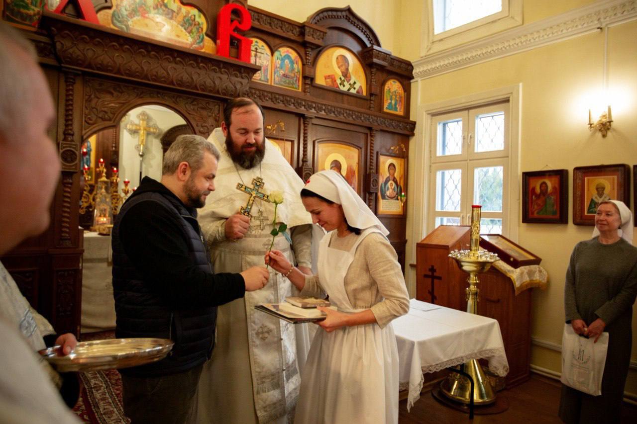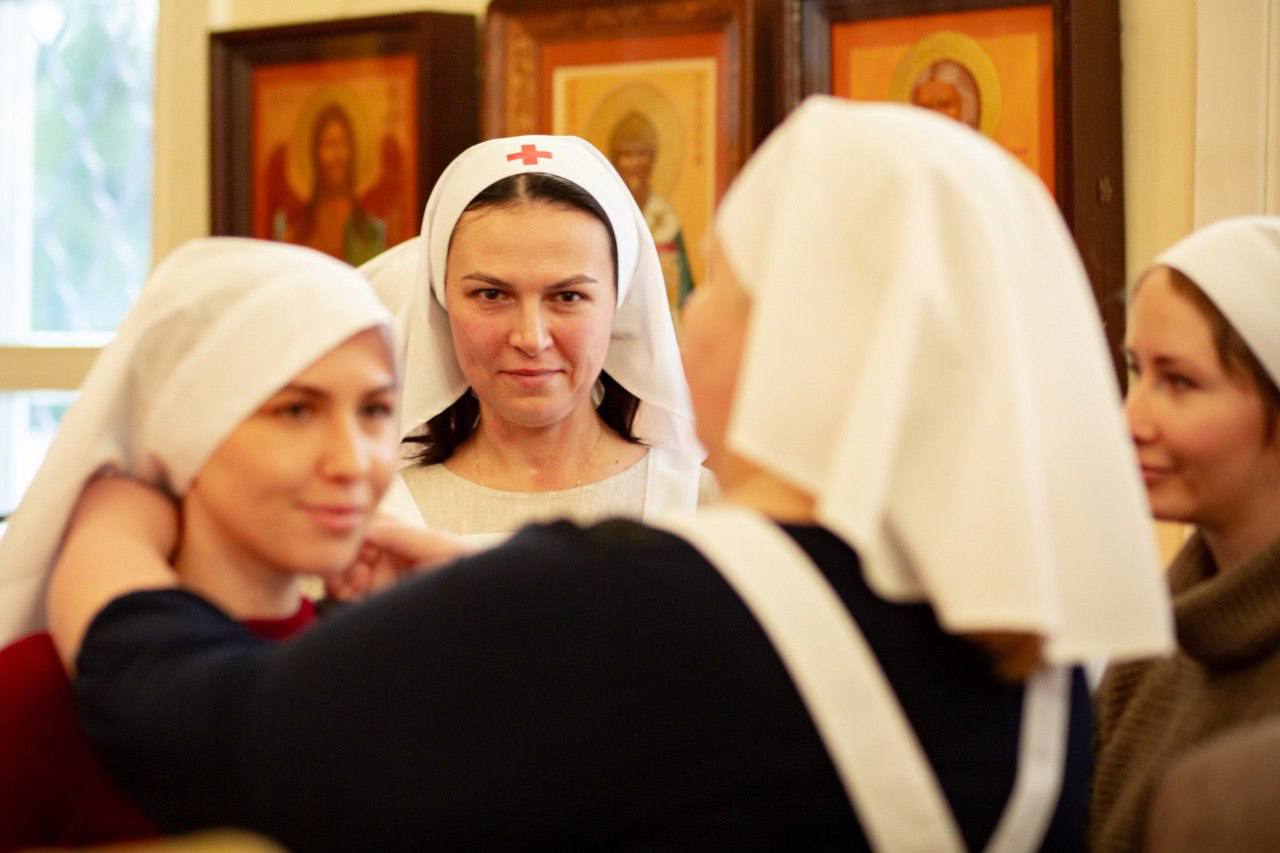По сложившейся традиции новых сестер облачали в освященную форму старшие посвященные сестры милосердия из других сестричеств. Старшая сестра милосердия Марфо-Мариинской обители Любовь Митичкина и главная сестра Переславского епархиального сестричества милосердия во имя свт. Луки Крымского Юлия Товстая помогли посвященной сестре Екатерине Александровой облачиться в освященную форму: надеть белый плат с красным крестом и фартук – символы бескорыстного сестринского служения больным. Испытуемые сестры получили белые платы.