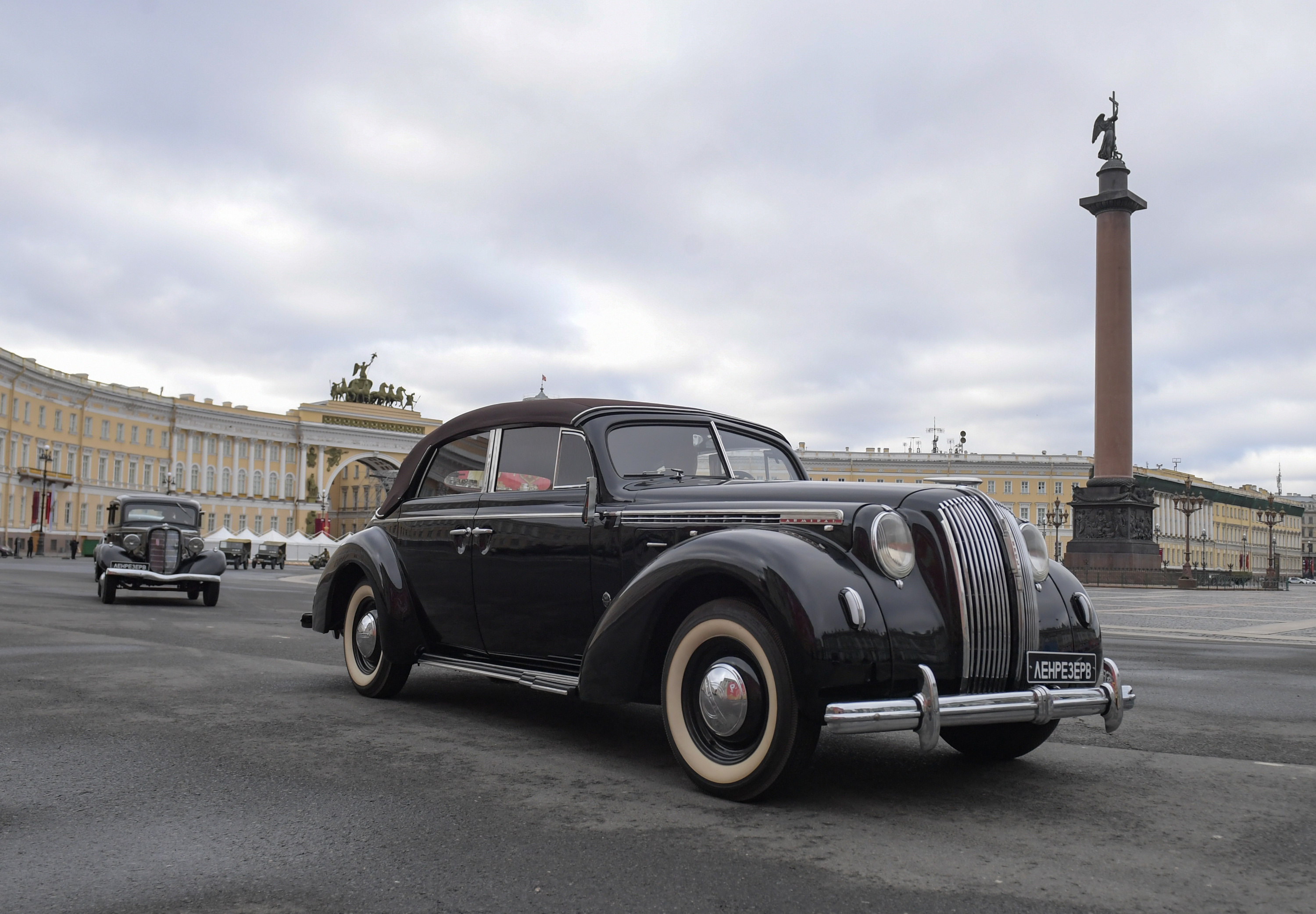 Кстати, о передвижной выставке. Вот, как она выглядит. Это Миллионная улица незадолго до начала парада. Узнаете легендарные машины времен Великой Отечественной войны?