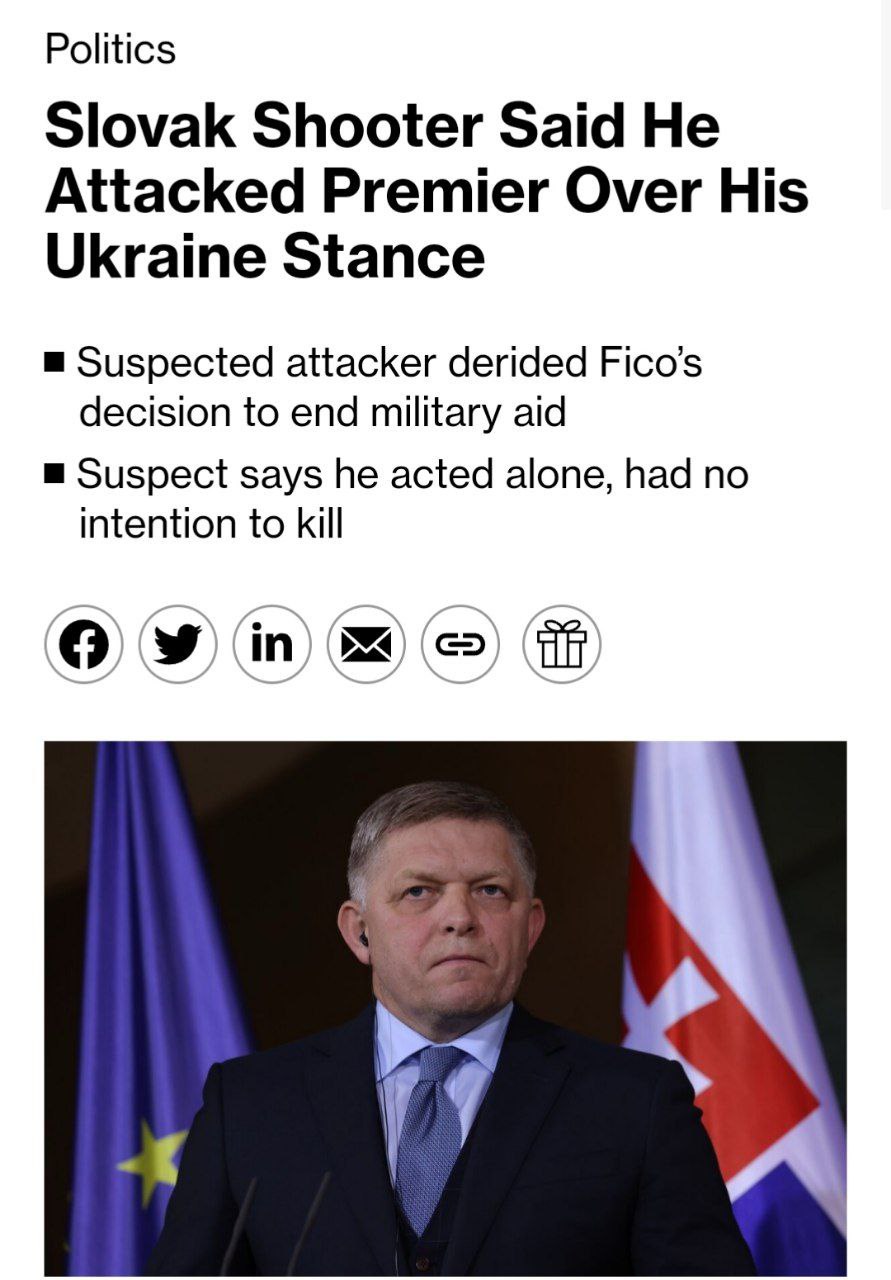 Нападавший, обвиняемый в стрельбе в премьер-министра Словакии Роберта Фицо, заявил, что действовал из-за недовольства политикой правительства, прежде всего решением премьера прекратить военную поддержку Украины, говорится в судебном документе.