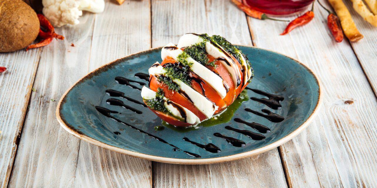 3. Выложите на тарелку. Подсолите, полейте песто и бальзамическим соусом.