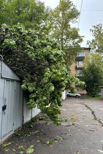 Ураган промчался по Сестрорецку. В результате затопило улицу, деревья упали на проезжую часть, попутно порвав провода. Часть деревьев пришлось убирать местным жителям.