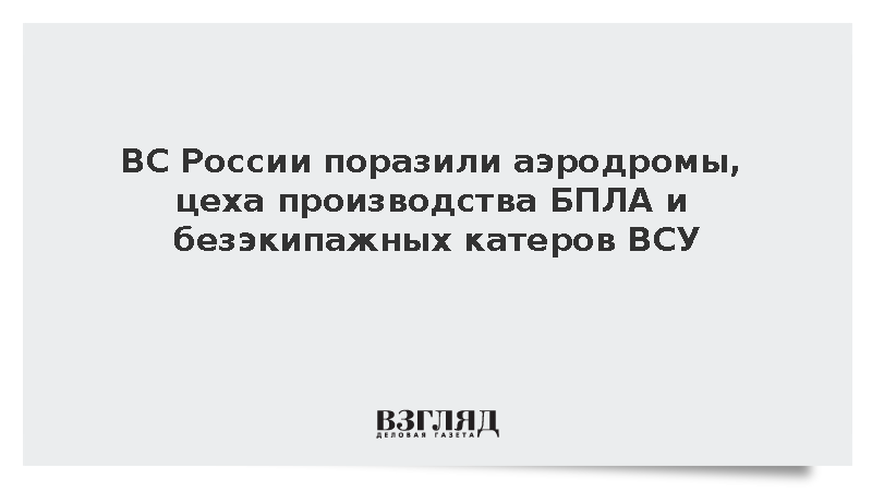 Оперативно-тактической авиацией, ударными беспилотниками, ракетными войсками и артиллерией группировок войск ВС России нанесено поражение инфраструктуре военных аэродромов, цехам производства и складам хранения БПЛА и безэкипажных катеров, сообщили в Минобороны.