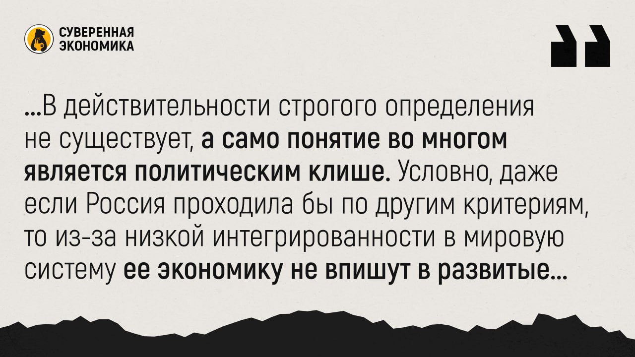 В действительности строгого определения не существует, а само понятие во многом является политическим клише. Условно, даже если Россия проходила бы по другим критериям, то из-за низкой интегрированности в мировую систему ее экономику не впишут в развитые. Так и МВФ, контролируемый западными элитами, может расширять или сужать рамки, в зависимости от задач.