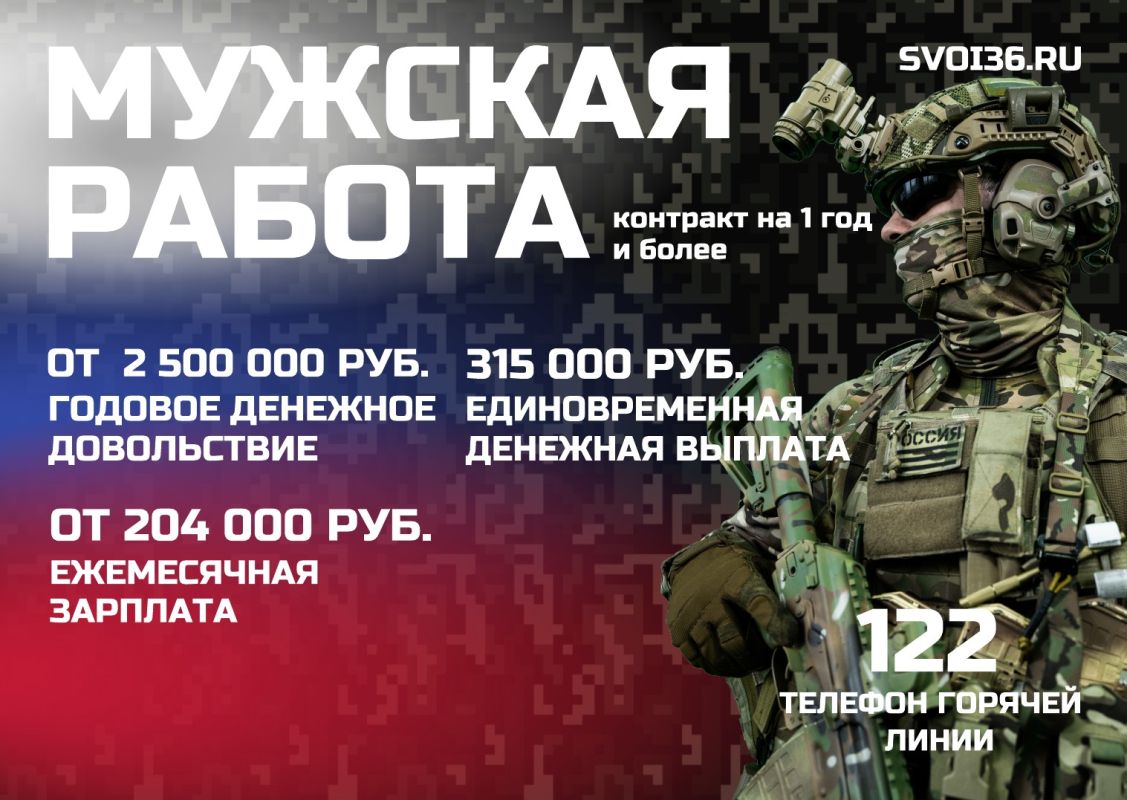 Напоминаем, что всем воронежцам, заключившим контракт с Министерством обороны, полагается единовременная выплата в размере 315 тысяч рублей, статус ветерана боевых действий, а также социальная поддержка со стороны правительства Воронежской области всех военнослужащих и членов их семей. Например, зачисление в первоочередном порядке детей участников СВО, которые учатся с 1-го по 6-й класс, в группы продленного дня. Контракт заключается на срок от одного года со всеми категориями граждан. Подробности на сайте svoi36.ru, по телефону 122 или в пункте отбора на контрактную службу по адресу: Воронеж, улица Фридриха Энгельса, 52.