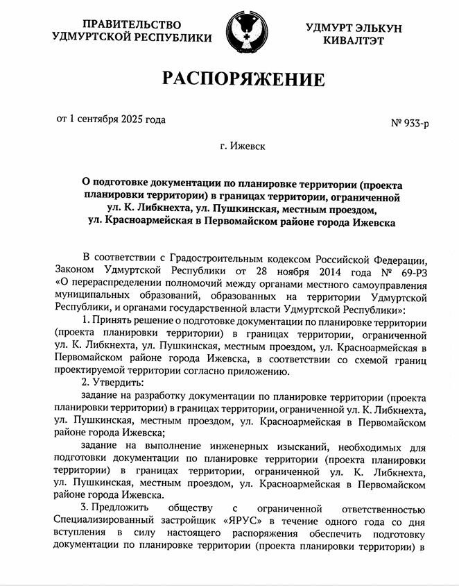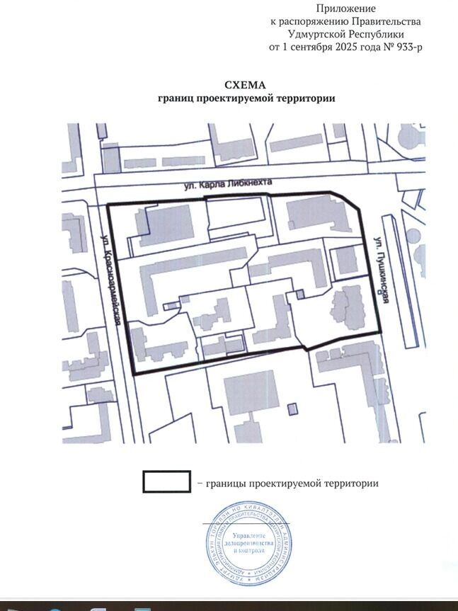 В документе содержится предписание о начале разработки проекта планировки территории, ограниченной улицами Карла Либкнехта, Пушкинской, Красноармейской и проездом, идущим параллельно Карла Либкнехта. Площадь участка составляет 6,13 гектара.