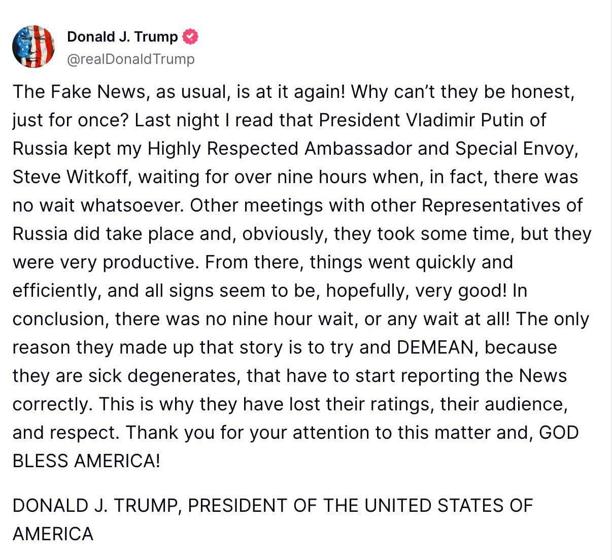 «Фейковые новости снова за своё! Почему они не могут быть честными хотя бы раз? Вчера я прочитал, что Путин заставил моего уважаемого спецпосланника Стива Уиткоффа ждать девять часов. На самом деле никакого ожидания не было вообще! Это просто очередная попытка унизить, потому что они больные дегенераты. Именно поэтому они теряют рейтинги, аудиторию и уважение».